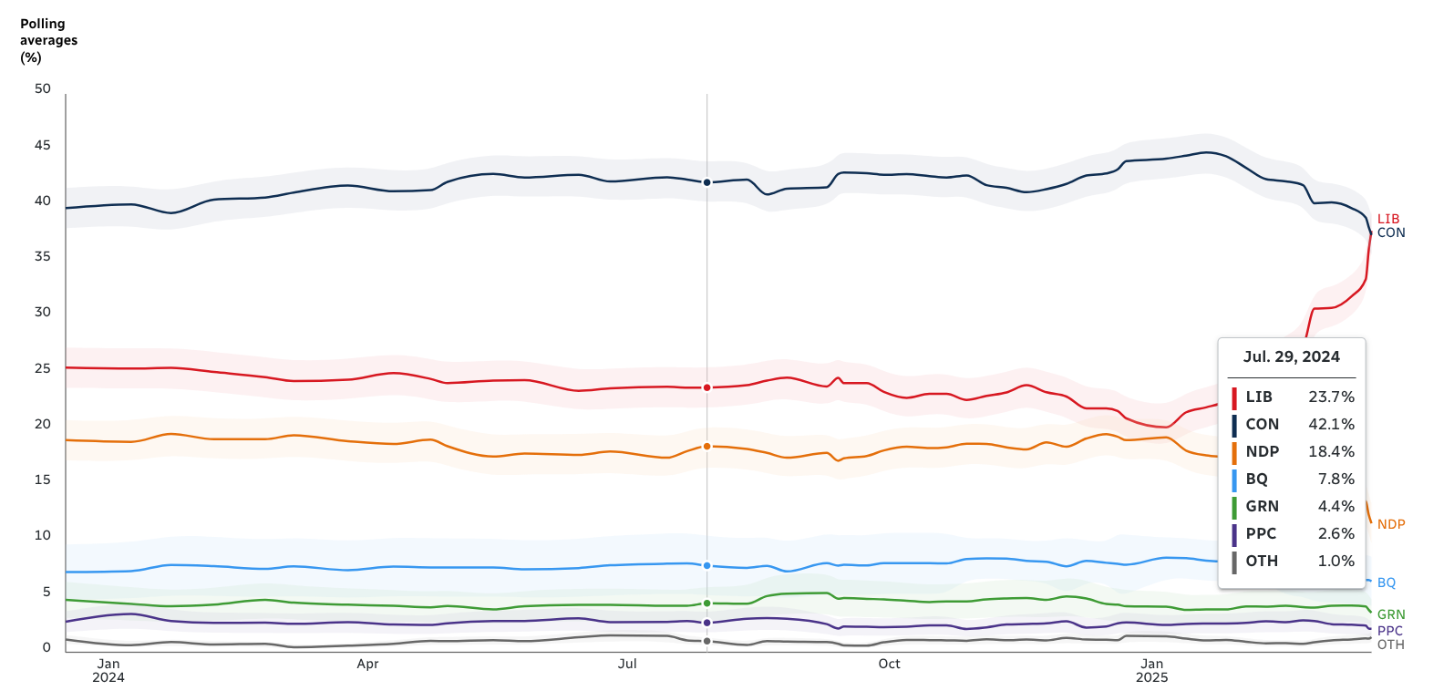 In Canada we're starting to see the concrete electoral effect of this. Trump's return and his childlike imperialist threats have eradicated a seemingly unconquerable Conservative lead.