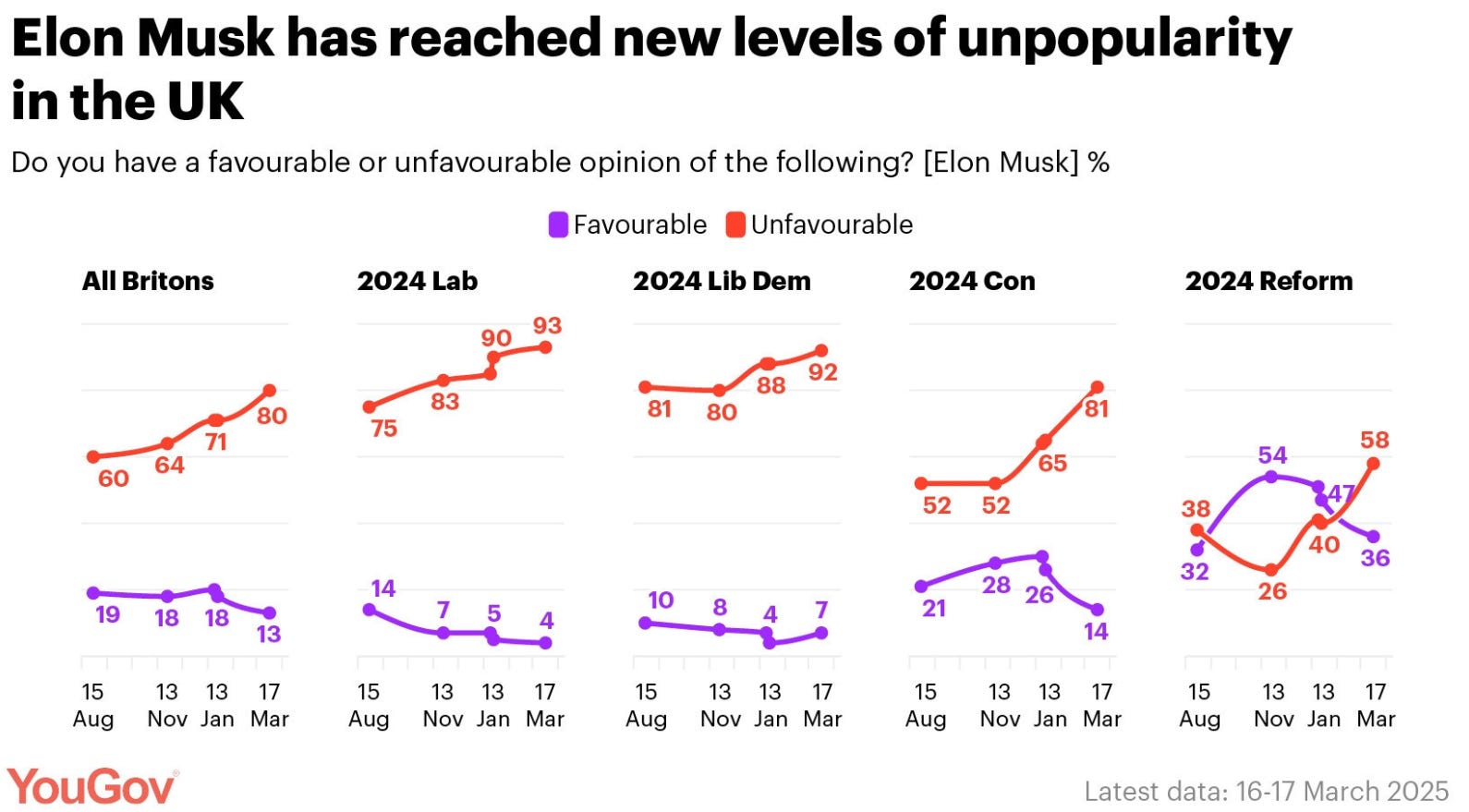 In the UK, the country is unified in its rejection of Trump and Musk, in every demographic, across support for all parties - with even Reform voters starting to turn.